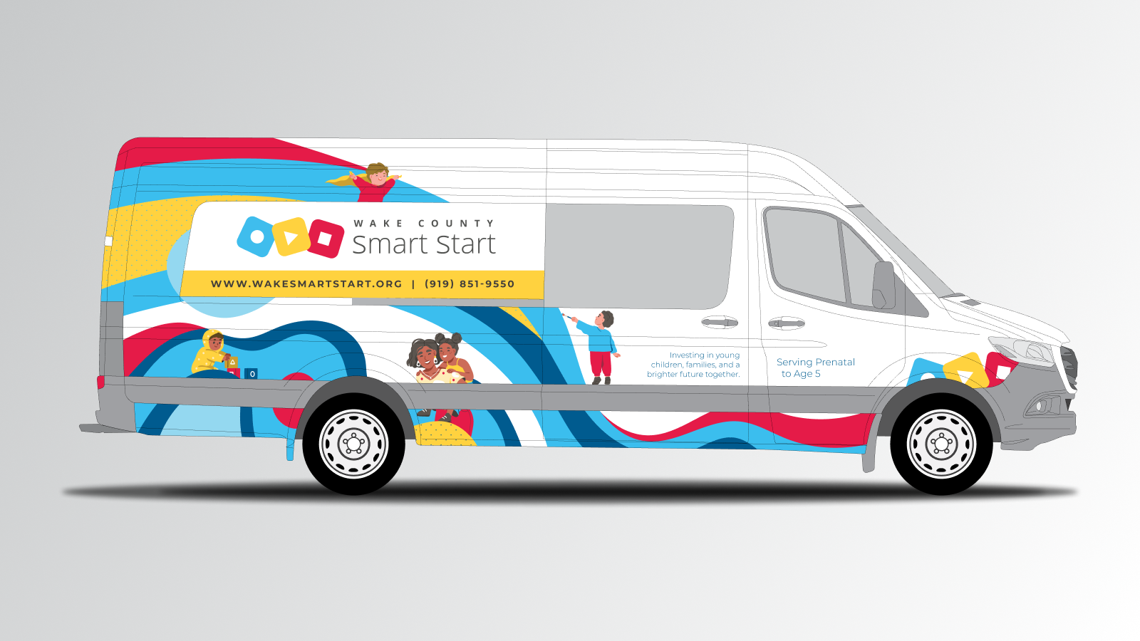 Wake County Smart Start is an organization that assists underserved families with early development education. Their van helps WCSS outreach and assist families directly. To make the van stand out, WCSS wanted a wrap that was distinct, fun, inviting, and leaned into their branding. The final design is bold and colorful, depicting families from diverse backgrounds layered within an eye-catching abstraction of flowing colors.